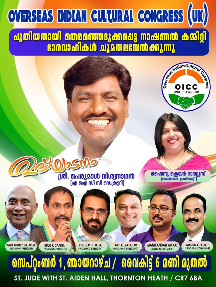ലണ്ടൻ: ഒ ഐ സി സി (യു കെ) -യുടെ പുതിയ നാഷണൽ കമ്മിറ്റി സെപ്റ്റംബർ 1 – ന് ചുമതയേൽക്കും. ലണ്ടനിലെ ക്രോയ്ഡനിൽ വച്ചു സംഘടിപ്പിക്കുന്ന സമ്മേളനം എ ഐ സി സി സെക്രട്ടറി പെരുമാൾ വിശ്വനാഥൻ ഉദ്ഘാടനം ചെയ്യും.