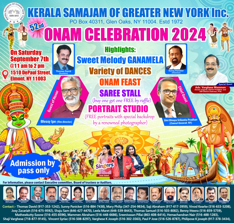 ന്യൂയോർക്ക്: നോർത്ത് അമേരിക്കയിലെ ഏറ്റവും പുരാതന മലയാളീ അസ്സോസ്സിയേഷനായ കേരളാ സമാജം ഓഫ് ഗ്രെയ്റ്റർ ന്യൂയോർക്ക് 2024-ലെ ഓണാഘോഷം സെപ്റ്റംബർ 7 ശനിയാഴ്ച രാവിലെ 11 മണി മുതൽ ഏറ്റവും സമുചിതമായി ആഘോഷിക്കുവാൻ തയ്യാറെടുക്കുന്നു. കഴിഞ്ഞ 52-ലധികം വർഷമായി ന്യൂയോർക്കിലെ ലോങ്ങ് ഐലൻഡ് കേന്ദ്രീകൃതമായി പ്രവർത്തിക്കുന്ന ആദ്യകാല മലയാളീ സംഘടനയാണ് കേരളാ സമാജം ഓഫ് ഗ്രെയ്റ്റർ ന്യൂയോർക്ക്. എൽമോണ്ടിലുള്ള സെൻറ് വിൻസെൻറ് ഡീപോൾ സീറോ മലങ്കര കാത്തലിക്ക് പള്ളിയുടെ പുതിയ ഓഡിറ്റോറിയത്തിൽ (St. Vincent DePaul Syro Malankara Catholic Cathedral, 1500 St. Vincent Street, Elmont, NY 11003) വച്ചാണ് ഈ വർഷത്തെ ഓണാഘോഷവും ഓണ സദ്യയും ശനിയാഴ്ച രാവിലെ 11 മുതൽ ക്രമീകരിച്ചിരിക്കുന്നത്.