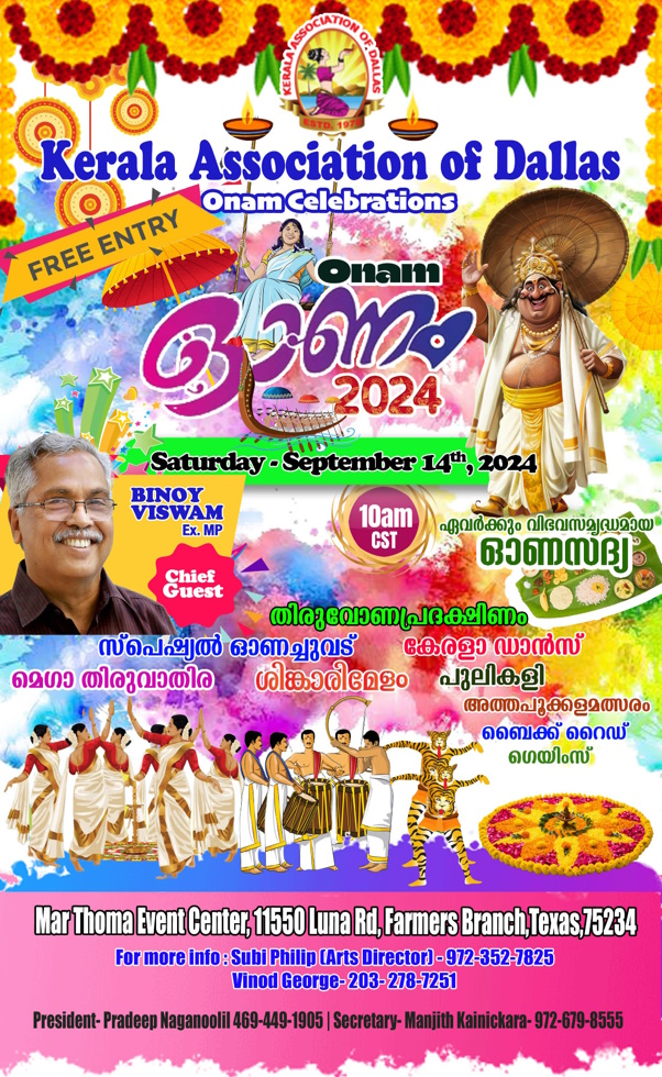 ഗാർലാൻഡ് (ടെക്സാസ്) കേരള അസോസിയേഷൻ ഓഫ് ഡാളസ് സെപ്റ് 14 ശനിയാഴ്ച രാവിലെ 10 മണിക്ക് മാർത്തോമാ ഇവൻറ് സെന്റർ ഫാര്മേഴ്സ് ബ്രാഞ്ചിൽ സംഘടിപ്പിക്കുന്ന ഓണാഘോഷ പരിപാടികളിൽ മുഖ്യാതിഥിയായി മുൻ മന്ത്രിയും സി പി ഐ സംസ്ഥാന സെക്രട്ടറിയുമായ ബിനോയ് വിശ്വം എം പി പങ്കെടുക്കും. കേരള അസോസിയേഷൻ കോൺഫറൻസ് ഹാളിൽ വച്ച് നടത്തപ്പെട്ട വോളണ്ടിയേഴ്സ് മീറ്റിങ്ങിലാണ് ഓണാഘോഷ പരിപാടികളെ കുറിച്ച് പ്രസിഡന്റ് നാഗനൂലിൽ വിശദീകരിച്ചത് .