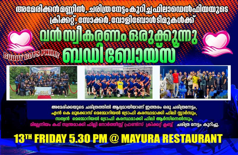 ഫിലഡൽഫിയ മലയാളികൾക്ക് അഭിമാനമായി, ചരിത്ര നേട്ടം കുറിച്ച ക്രിക്കറ്റ്, സോക്കർ, വോളീബോൾ ടീമുകൾക്ക് ബഡി ബോയ്സ് വൻ സ്വീകരണമൊരുക്കുന്നു