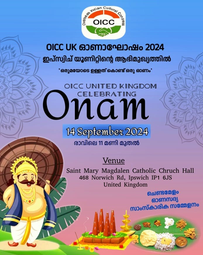 ഇപ്സ്വിച്ച്: ഒ ഐ സി സി (യു കെ) നാഷണൽ കമ്മിറ്റിയുടെ ആഭിമുഖ്യത്തിൽ ഈ വർഷത്തെ ഓണാഘോഷ പരിപാടികൾ സെപ്റ്റംബർ 14 – ന് ഇപ്സ്വിച്ചിൽ വച്ചു സംഘടിപ്പിക്കും. സെന്റ്. മേരീ മഗ്ദേലീൻ കാത്തലിക് ചർച്ച ഹാളാണ് പരിപാടിക്കായി ഒരുക്കിയിരിക്കുന്നത്. രാവിലെ 11 മണി മുതൽ ആരംഭിക്കുന്ന ആഘോഷപരിപാടികൾ ഒ ഐ സി സി (യു കെ) നാഷണൽ പ്രസിഡന്റ് ഷൈനു ക്ലെയർ മാത്യൂസ് ഉദ്ഘാടനം ചെയ്യും. ഒ ഐ സി സി നാഷണൽ / റീജിയൻ നേതാക്കന്മാരും സാംസ്കാരിക പ്രവർത്തകരും യു കെയിലെ വിവിധ ഇടങ്ങളിൽ നിന്നുമുള്ള പ്രവർത്തകരും ആഘോഷ പരിപാടികളുടെ ഭാഗമാകും.
