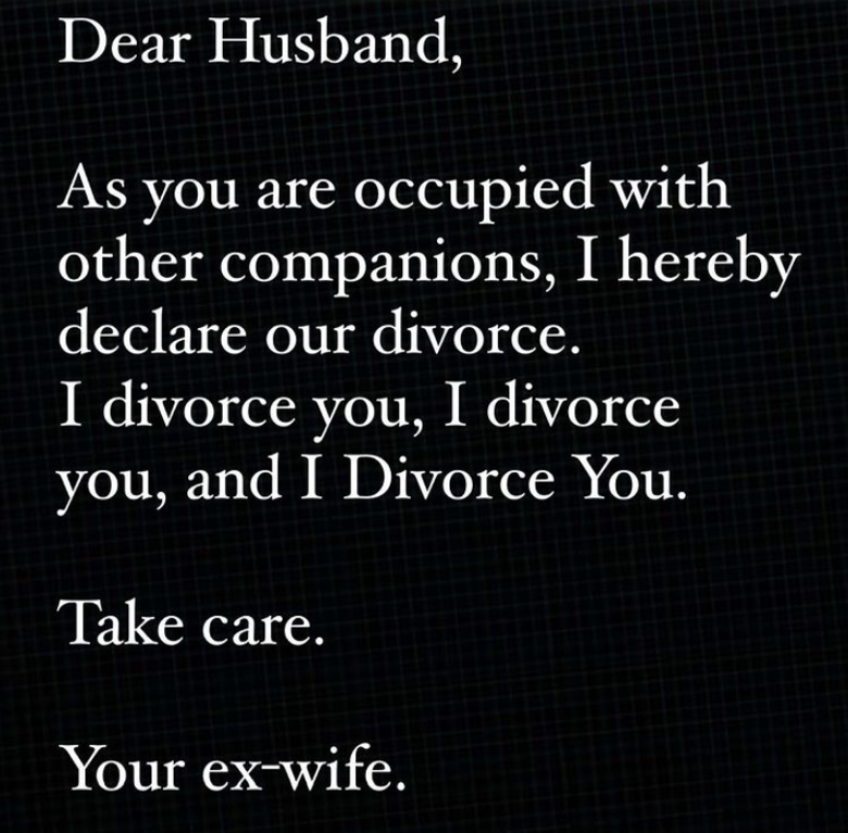 “പ്രിയ ഭർത്താവേ, നിങ്ങൾ മറ്റ് കൂട്ടാളികളുമായി തിരക്കിലായതിനാൽ, ഞങ്ങളുടെ വിവാഹമോചനം ഞാൻ ഇതിനാൽ പ്രഖ്യാപിക്കുന്നു. ഞാൻ നിങ്ങളെ വിവാഹമോചനം ചെയ്യുന്നു, ഞാൻ നിങ്ങളെ വിവാഹമോചനം ചെയ്യുന്നു, ഞാൻ നിങ്ങളെ വിവാഹമോചനം ചെയ്യുന്നു. ശ്രദ്ധപുലർത്തുക. നിങ്ങളുടെ മുൻ ഭാര്യ,” ഈ വർഷം ജൂലൈയിൽ ഒരു ഇൻസ്റ്റാഗ്രാം പോസ്റ്റിൽ ഷെയ്ഖ മഹ്റ എഴുതി.