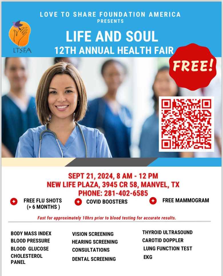 ഹൂസ്റ്റൺ: ലവ് റ്റു ഷെയർ ഫൗണ്ടേഷൻ്റെ (Love to Share Foundation America) ആഭിമുഖ്യത്തിൽ വർഷംതോറും തുടർച്ചയായി നടത്തിവരുന്ന ഫ്രീ ഹെൽത്ത് ഫെയർ പന്ത്രണ്ടാം വർഷമായ ഇത്തവണയും ഡോ. ലക്ഷ്മി നായരുടെ സായി പ്രൈമറി കെയർ ക്ലിനിക്/ ന്യൂ ലൈഫ് പ്ലാസയിൽ വെച്ച് (3945, CR 58, മാൻവെൽ, ടെക്സാസ് -77578 ) പ്രമുഖ ആശുപത്രികളുടെയും ഫാർമസികളുടെയും മറ്റു ചില മുഖ്യ സ്ഥാപനങ്ങളുടെയും സഹകരണത്തോടെ നടത്തുന്നതാണ്.