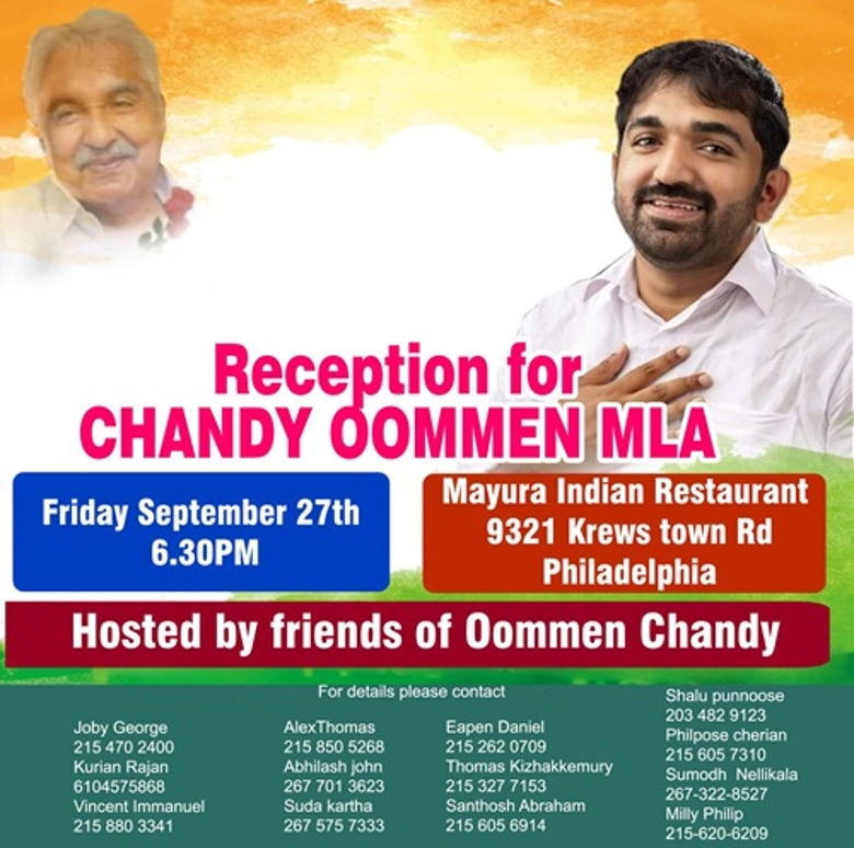 ഫിലാഡൽഫിയ: അമേരിക്കൻ പ്രെവാസികളെ സന്ദർശിക്കാനെത്തിയ ചാണ്ടി ഉമ്മൻ എം എൽ എ ക്കു സെപ്റ്റംബർ 27 വെള്ളിയാഴ്ച വൈകിട്ട് 6:30 ന് ഫിലഡൽഫിയയിൽ മയൂര ഇന്ത്യൻ റെസ്റ്റോറൻറ്റിൽ വച്ച് (9321 Krews town road, Philadelphia) സ്വീകരണം നൽകപ്പെടുന്നു.