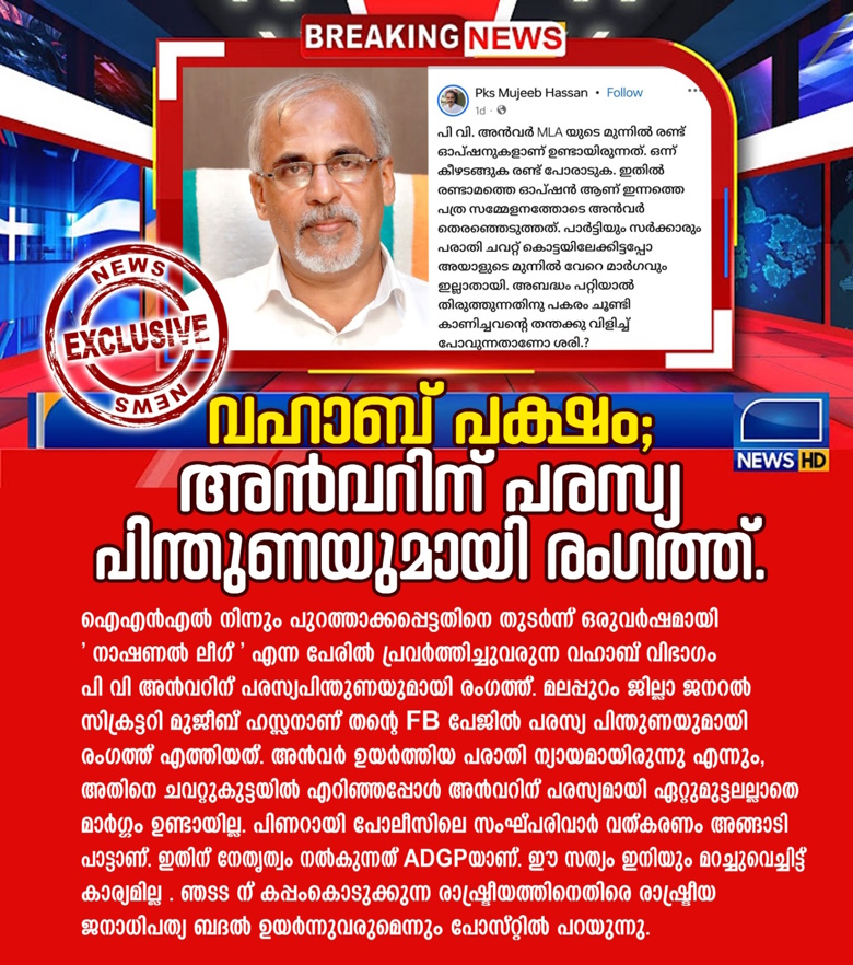നിലവിൽ LDF ൻ്റെ ഭാഗമല്ലാതെ സഹകരിപ്പിക്കുന്ന പാർട്ടികളിൽപ്പെട്ട ‘ വഹാബ് വിഭാഗം ‘ അൻവറിൻ്റെ നേതൃത്വത്തിൽ പുതുതായി രൂപപ്പെടുന്ന ഇടതു വിരുദ്ധ ചേരിയുടെ ഭാഗമാഗാൻ തയ്യാറായി എന്നാണ് വാർത്തകൾ. മുഖ്യമന്ത്രിയും, പാർട്ടി സിക്രട്ടറിയും അൻവറിനെ പരസ്യമായി തളളിപ്പറഞ്ഞതിന് ശേഷം, മുഖ്യമന്ത്രിക്കും, പാർട്ടിക്കുമെതിരെ അതിരൂക്ഷമായ ഭാഷയിൽ അൻവർ കടന്നാക്രമണം നടത്തിയ ശേഷമാണ് ജില്ലാ ജനറൽ സിക്രട്ടറിയുടെ FB പോസ്റ്റ് എന്നത് ശ്രദ്ധേയമാണ്. വ്യക്തിഗത പിന്തുണക്കപ്പുറം ഒരു സംഘടന എന്ന നിലയിൽ ചെറുതാണെങ്കിലും അൻവറിന് ലഭിക്കുന്ന ആദ്യപിന്തുണയാണ് വഹാബ് പക്ഷം നാഷണൽ ലീഗിൻ്റെത്.