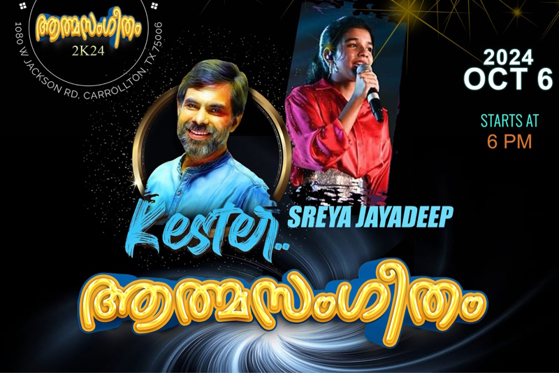 ഡാളസ്: ക്രൈസ്തവസംഗീത മേഖലയിലെ അനുഗ്രഹീത ഗായകൻ കെസ്റ്റർ നയിക്കുന്ന ഭക്തിഗാനമേളയായ ആത്മസംഗീതം മ്യൂസിക്കൽ നൈറ്റ് ഡാലസിൽ ഒക്ടോബർ 6 ന്. സിനിമ പിന്നണി ഗായികയും ശ്രോതാക്കൾക്ക് പ്രിയങ്കരിയുമായ ശ്രേയാ ജയദീപും ടീമിലുണ്ട്.