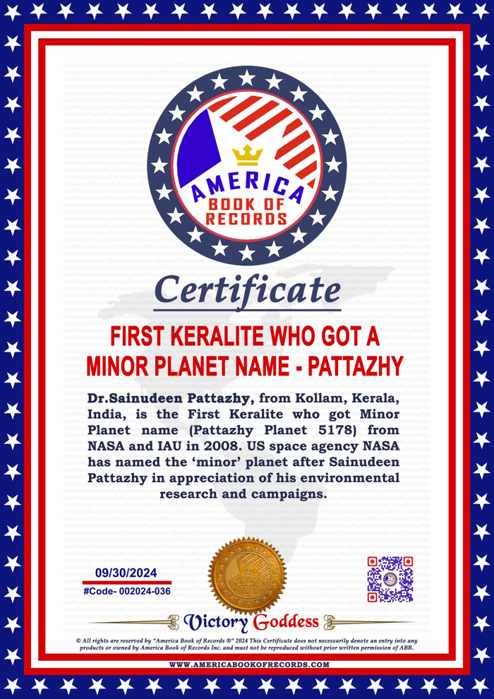 ഒരു ചെറുഗ്രഹത്തിനു (പട്ടാഴി ഗ്രഹം 5178) പേരു ലഭിച്ച ആദ്യത്തെ മലയാളി ശാസ്ത്ര, പരിസ്ഥിതി ശാസ്ത്രജ്ഞനായ ഡോ. സൈനുദീൻ പട്ടാഴി ആണെന്നും, കേരളത്തിന് ലഭിച്ച ആദ്യത്തെ ഗ്രഹം പട്ടാഴി ഗ്രഹം 5178 ആണെന്നും, അന്തർദേശീയ അംഗീകാരം നേടി അമേരിക്ക ബുക്ക് ഓഫ് റെക്കോർഡ്സിൽ സ്ഥാനം ലഭിച്ചു.