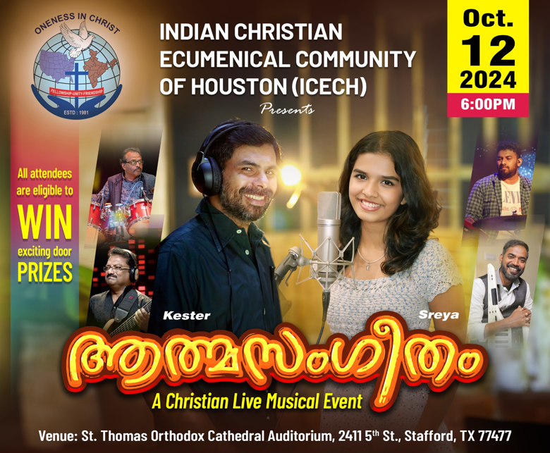 ഹൂസ്റ്റൺ: ഇന്ത്യൻ ക്രിസ്ത്യൻ എക്യൂമിനിക്കൽ കമ്മ്യൂണിറ്റി ഓഫ് ഹുസ്റ്റന്റെ ആഭിമുഖ്യത്തിൽ (ICECH) ക്രൈസ്തവ സംഗീത മേഖലയിലെ അനുഗ്രഹീത ഗായകൻ കെസ്റ്ററും സുപ്രസിദ്ധ ഗായിക ശ്രേയ ജയദീപും സംഘവും നയിക്കുന്ന ക്രിസ്തീയ ഗാനസന്ധ്യ ” ആത്മസംഗീതം” ലൈവ് മ്യൂസിക്കൽ നൈറ്റ് ഒക്ടോബർ 12 ന് വൈകിട്ടു 6 മണിക്ക് ഹൂസ്റ്റൺ സെന്റ് തോമസ് ഓർത്തഡോൿസ് കത്തിഡ്രൽ ഹാളിൽ വെച്ച് നടത്തപ്പെടുന്നു.