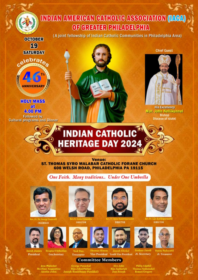 ഒക്ടോബര് 19 ശനിയാഴ്ച്ചയാണു “ഒരേ വിശ്വാസം, പല പാരമ്പര്യങ്ങള്, ഒരു കുടക്കീഴില്” എന്ന ആപ്തവാക്യത്തിലൂന്നി ഇന്ത്യന് കത്തോലിക്കരുടെ പൈതൃക ദിനാഘോഷങ്ങള് സംഘടിപ്പിക്കുന്നത്. വൈകുന്നേരം നാലു മണി മുതല് ഫിലഡല്ഫിയ സെന്റ് തോമസ് സീറോ മലബാര് പള്ളിയില് (608 Welsh Road, Philadelphia PA 19115) നടക്കുന്ന ഹെറിറ്റേജ് ദിനാഘോഷങ്ങളില് മുഖ്യാതിഥിയായി ഇടുക്കി സീറോ മലബാര് കത്തോലിക്കാ രൂപതയുടെ മെത്രാന് മാര് ജോണ് നെല്ലിക്കുന്നേല് ദിവ്യബലിയിലും പൊതുസമ്മേളനത്തിലും പങ്കെടുക്കും. അന്നേദിവസം നാലു മണിക്ക് അഭിവന്ദ്യ ബിഷപ്പിന്റെ മുഖ്യ കാര്മ്മികത്വത്തിലും, ഐ. എ. സി. എ. കൂട്ടായ്മയുടെ നേതൃത്വം വഹിക്കുന്ന വൈദികരുടെ സഹകാര്മ്മികത്വത്തിലും കൃതഞ്ജതാ ബലിയര്പ്പണം നടക്കും.