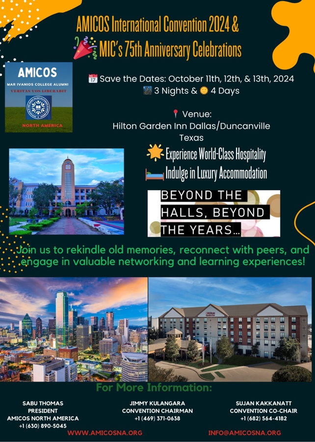 ഡാലസ് : തിരുവനന്തപുരം മാർ ഇവാനിയോസ് കോളേജ് പൂർവ്വ വിദ്യാർത്ഥി സംഘടന ആയ അസോസിയേഷൻ ഓഫ് മാർ ഇവാനിയോസ് കോളേജ് ഓൾഡ് സ്റ്റുഡൻസ് (അമിക്കോസ് ) നോർത്ത് അമേരിക്കയുടെ നേതൃത്വത്തിൽ അന്താരാഷ്ട്ര കൺവെൻഷനും, എഴുപത്തിയഞ്ചാം വാർഷിക സമ്മേളനത്തിനും നാളെ വൈകിട്ട് 5 മണിക്ക് ഡാളസിൽ തുടക്കം കുറിക്കും.