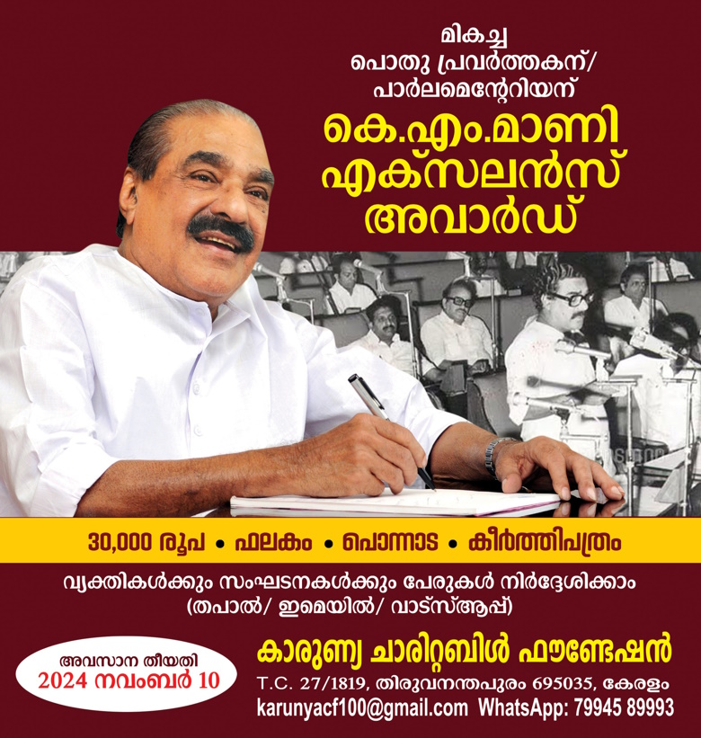 ജനാധിപത്യ കേരളത്തിന്‌ മറക്കാനാവാത്ത ശ്രീ. കെ.എം. മാണിയുടെ പേരില്‍, ഏറ്റവും മികച്ച പൊതുപ്രവര്‍ത്തകന്/പാര്‍ലമെന്റേറിയന്‌, കെ.എം. മാണി എക്സലന്‍സ്‌ അവാര്‍ഡ്‌ ഏര്‍പ്പെടുത്തുവാന്‍ കാരുണ്യ ചാരിറ്റബിള്‍ ഫൗണ്ടേഷന്‍ തീരുമാനിച്ചിരിക്കുന്നു.