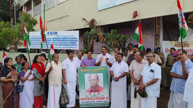 എടത്വ: കർഷകൻ ബെന്നി ജോസഫിന്റെ മരണത്തിന് ഉത്തരവാദികളായ എടത്വ കെ എസ് ഇ ബി ഉദ്യോഗസ്ഥർക്കെതിരെ നടപടി എടുക്കുക എന്നാവശ്യപ്പെട്ട് എടത്വ മണ്ഡലം കോൺഗ്രസ് കമ്മിറ്റി കെ എസ് ഇ ബി എടത്വ ഓഫീസിലേക്ക് പ്രതിഷേധ മാർച്ച് ആലപ്പുഴ ജില്ലാ കോൺഗ്രസ് കമ്മറ്റിയുടെ ഉപാധ്യക്ഷൻശ്രീ സജി ജോസഫ് ഉദ്ഘാടനം ചെയ്തു.