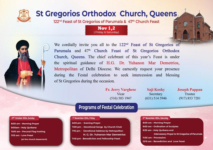 ന്യൂയോർക്ക് : ക്വീൻസ് സെന്റ് ഗ്രീഗോറിയോസ് ഓർത്തഡോക്സ് ഇടവകയുടെ ആഭിമുഖ്യത്തിൽ പരിശുദ്ധ പരുമലതിരുമേനിയുടെ ഓർമ്മപെരുന്നാൾ വിപുലമായ ചടങ്ങുകളോടെ ആഘോഷിക്കുന്നു,