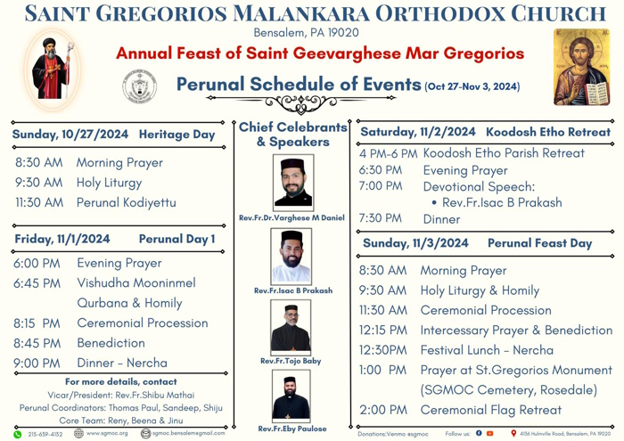നവംബർ രണ്ടിന് ശനിയാഴ്ച വൈകിട്ട് 4 മണി മുതൽ 6 മണി വരെ കൂദോശ് ഈത്തോ കോൺഫ്രൺസ്, 6 30 മുതൽ സന്ധ്യാ നമസ്കാരം 7:00 മുതൽ റവ. ഫാ. ഐസക്ക് ബി പ്രകാശ് വചന പ്രഘോഷണം നടത്തും. അതിനെത്തുടർന്ന് അത്താഴ വിരുന്നും ഉണ്ടായിരിക്കും.