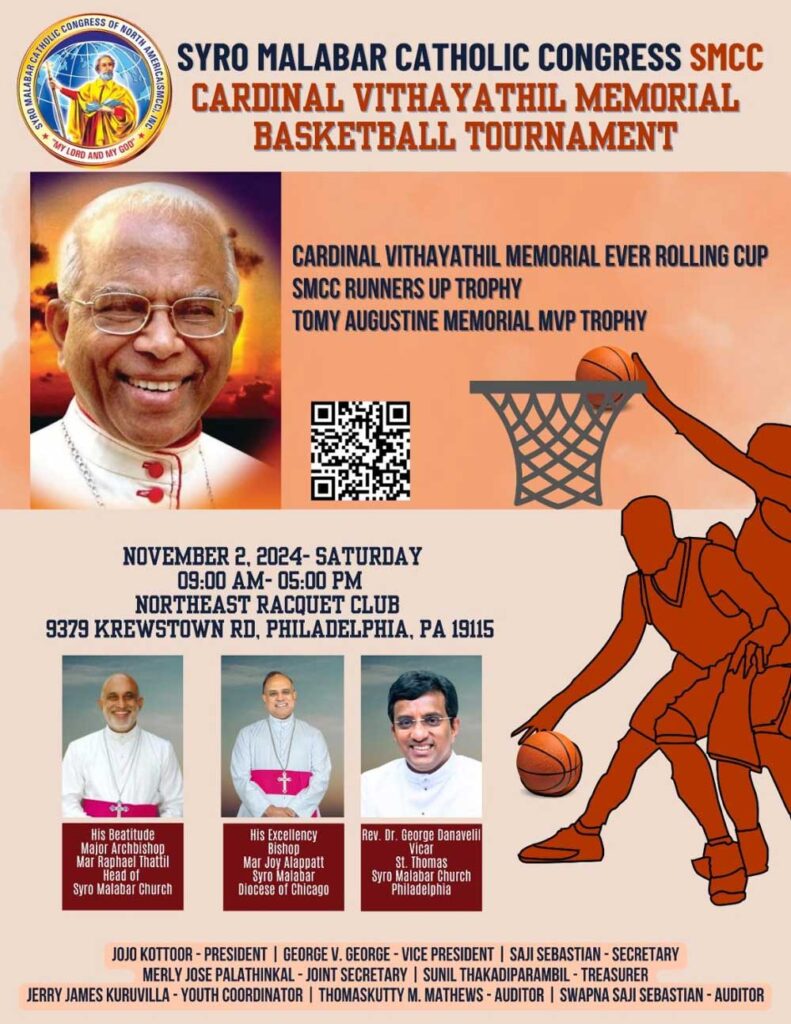 ഫിലാഡല്ഫിയ: ചിക്കാഗൊ സീറോമലബാര് കത്തോലിക്കാ രൂപതയുടെ അത്മായ സംഘടനയായ സീറോമലബാര് കത്തോലിക്കാ കോണ്ഗ്രസിന്റെ (എസ് എം സി സി) ഫിലാഡല്ഫിയാ ചാപ്റ്റര് ദേശീയതലത്തില് എല്ലാവര്ഷവും നടത്തിവരുന്ന കര്ദ്ദിനാള് മാര് വര്ക്കി വിതയത്തില് മെമ്മോറിയല് ബാസ്കറ്റ്ബോള് ടൂര്ണമെന്റ് നവംബര് 2 ശനിയാഴ്ച്ച രാവിലെ എ’ു മണിമുതല് ഫിലാഡല്ഫിയാ നോര്ത്തീസ്റ്റ് റാക്കറ്റ് ക്ലബിന്റെ (NERC, 9379 Krewstown Road, Philadelphia PA 19115) ഇന്ഡോര് ബാസ്കറ്റ്ബോള് കോര്ട്ടില് നടക്കും.