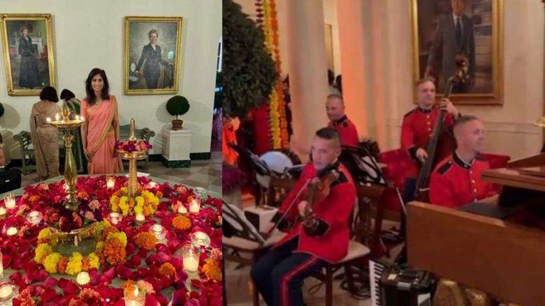 വൈറ്റ് ഹൗസ് ചടുലമായ ജമന്തി പൂക്കളിൽ അലങ്കരിച്ച വീഡിയോയുടെ പശ്ചാത്തലം ഉത്സവ അന്തരീക്ഷത്തിലേക്ക് ചേർത്തു, അതേസമയം നിരവധി അതിഥികൾ പരമ്പരാഗത ഇന്ത്യൻ വസ്ത്രങ്ങൾ ധരിച്ച് ചടങ്ങ് സ്വീകരിച്ചു.