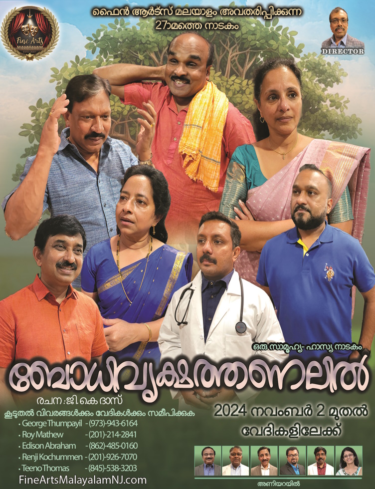ടീനെക്ക് (ന്യൂജെഴ്സി): ട്രൈസ്റ്റേറ്റ് ന്യൂജെഴ്സിയിലെ പ്രശസ്തരായ രാജൻ മിത്രാസ്, ജോസുകുട്ടി വലിയകല്ലുങ്കൽ, ബൈജു വറുഗീസ് തുടങ്ങിയവരൊക്കെ സോഷ്യൽ മീഡിയയിൽ ആവോളം പുകഴ്ത്തിയ ഫൈൻ ആർട്സ് മലയാളത്തിന്റെ, ഏറ്റവും പുതിയ, 67-ാമത് നാടകം “ബോധിവൃക്ഷത്തണലിൽ” നവംബർ 2 ശനിയാഴ്ച വൈകീട്ട് 5:30ന് ടാഫ്റ്റ് റോഡിലെ ബെഞ്ചമിൻ ഫ്രാങ്ക്ളിൻ മിഡിൽ സ്കൂളില് അരങ്ങേറും.