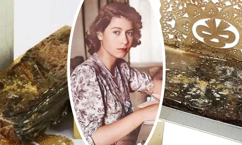 കേക്ക് സ്ലൈസ് അതിൻ്റെ യഥാർത്ഥ പാക്കേജിംഗിൽ, അന്നത്തെ എലിസബത്ത് രാജകുമാരിയുടെ വെള്ളി ചിഹ്നമുള്ള ഒരു ചെറിയ പെട്ടിയില് സൂക്ഷിച്ചിരുന്നു. ഉള്ളിൽ, ഒരു സങ്കീർണ്ണമായ ഡോയ്ലി 70 വർഷത്തിലേറെയായി കേക്ക് സംരക്ഷിക്കാൻ സഹായിച്ചു. സ്കോട്ട്ലൻഡിലെ എഡിൻബർഗിലെ ഹോളിറൂഡ്ഹൗസിൽ വീട്ടു ജോലിക്കാരിയായി സേവനമനുഷ്ഠിച്ച മരിയോൺ പോൾസൺ എന്ന സ്ത്രീക്ക് ഈ പ്രത്യേക ഭാഗം യഥാർത്ഥത്തിൽ സമ്മാനമായി നൽകിയിരുന്നു.