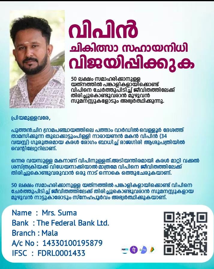 തൃശ്ശൂര് ജില്ലയിലെ പുത്തന്ചിറ ഗ്രാമപഞ്ചായത്ത് പത്താം വാര്ഡില് വെള്ളൂര് ദേശത്ത് താമസക്കാരനായ തുലാക്കാട്ടുംപ്പിള്ളി നാരായണന് മകന് വിപിന് (34) ആണ് കരള് മാറ്റിവെയ്ക്കല് ശസ്ത്രക്രിയക്ക് സഹായം തേടുന്നത്.