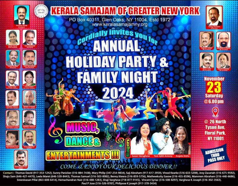 ന്യൂയോർക്ക്: ന്യൂയോർക്കിലെ മലയാളികളുടെ സാംസ്കാരിക പൈതൃകം നിലനിർത്തുന്ന ഈറ്റില്ലമായ കേരളാ സമാജം ഓഫ് ഗ്രെയ്റ്റർ ന്യൂയോർക്ക് 52-ാമത്  വാർഷിക ഹോളിഡേ പാർട്ടിയും ഫാമിലി നൈറ്റും നവംബർ 23 ശനിയാഴ്ച വൈകിട്ട് 6 മണി മുതൽ അതിവിപുലമായി ആഘോഷിക്കുന്നു. കഴിഞ്ഞ അഞ്ചു പതിറ്റാണ്ടിലേറെയായി ഒത്തൊരുമയോടെ പ്രവർത്തിച്ചു വരുന്ന കേരളാ സമാജം കൂടുതൽ അംഗങ്ങളെയും സുഹൃത്തുക്കളെയും പങ്കെടുപ്പിച്ച് കൊണ്ട് ഫ്ലോറൽ പാർക്കിലുള്ള ടൈസൺ സെന്ററിൽ (Tyson Center, 26 N Tyson Ave, Floral Park, NY 11001) ഫാമിലി നൈറ്റ് നടത്തുന്നതിനുള്ള ഒരുക്കങ്ങൾ പൂർത്തിയായി. കേരളാ സമാജത്തിന്റെ ഈ വർഷം നടത്തപ്പെട്ട പരിപാടികളെല്ലാം കൂടുതൽ ജനപങ്കാളിത്തം കൊണ്ട് ശ്രദ്ധേയമായിരുന്നു.