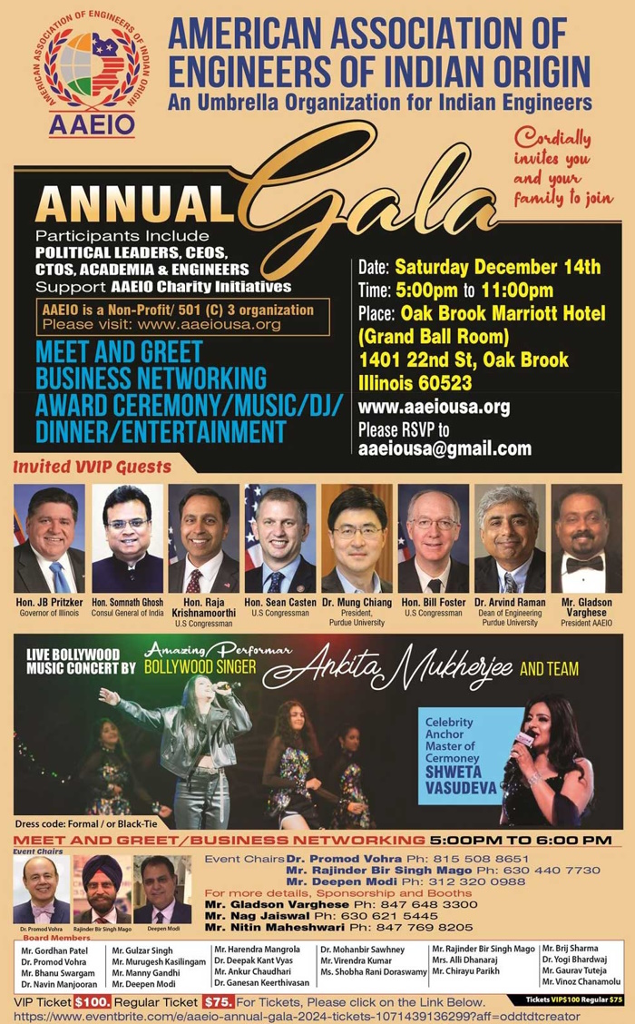 ചിക്കാഗോ: അമേരിക്കന് അസോസിയേഷന് ഓഫ് എന്ജിനീയേഴ്സ് ഓഫ് ഇന്ത്യന് ഒറിജിന്റെ വാര്ഷികാഘോഷം ഓക്ക് ബ്രൂക്ക് മാരിയറ്റിന്റെ ഗ്രാന്റ് ബാള്റൂമില് വെച്ച് ഡിസംബര് 14-ന് നടത്തപ്പെടുന്നതാണ്. ഇല്ലിനോയ്സ് ഗവര്ണ്ണര് ജെ.ബി. പ്രിറ്റ്സകര്, യു.എസ് കോണ്ഗ്രസ്മാന് രാജാ കൃഷ്ണമൂര്ത്തി, പെര്ഡ്യൂ യൂണിവേഴ്സിറ്റി പ്രസിഡന്റ് ഡോ. മുംഗ് ചിയാഗ്, യു.എസ് കോണ്ഗ്രസ്മാന് ബില് ഫോസ്റ്റര് എന്നീ പ്രമുഖ വ്യക്തികള് പങ്കെടുക്കുമെന്ന് AAEIO പ്രസിഡന്റും, G.Eയുടെ ഗ്ലോബല് ഡയറക്ടറുമായ ഗ്ലാഡ്സണ് വര്ഗീസ് അറിയിച്ചു.