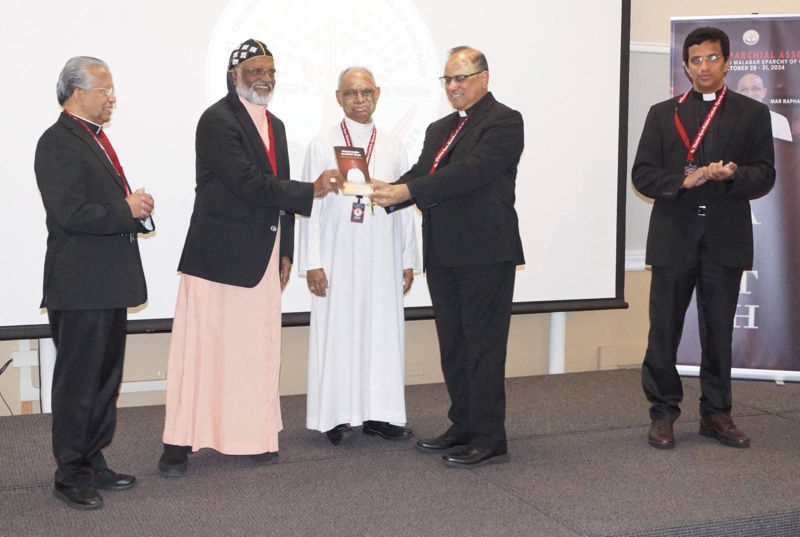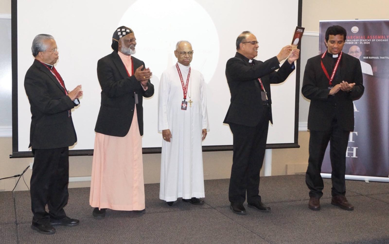 ചിക്കാഗോ സിറോ മലബാര് രൂപതയുടെ പ്രഥമ മെത്രാന് മാര് ജേക്കബ് അങ്ങാടിയത്തിന്റെ ജീവചരിത്രം “അത്യുന്നതങ്ങളില് ദൈവത്തിനു സ്തുതി ” ചിക്കാഗോയില് നടന്ന സിറോ മലബാര് എപ്പാര്ക്കിയല് അസ്സംബ്ലിയിയുടെ സമാപന സമ്മേളത്തില് വച്ച് ബിഷപ്പ് മാര് ജോയ് ആലപ്പാട്ട്, സിറോ മലങ്കര രൂപത ബിഷപ്പ് ഫിലിപ്പോസ് മാര് സ്റ്റീഫനോസിന് ആദ്യപ്രതി നല്കി പ്രകാശനം