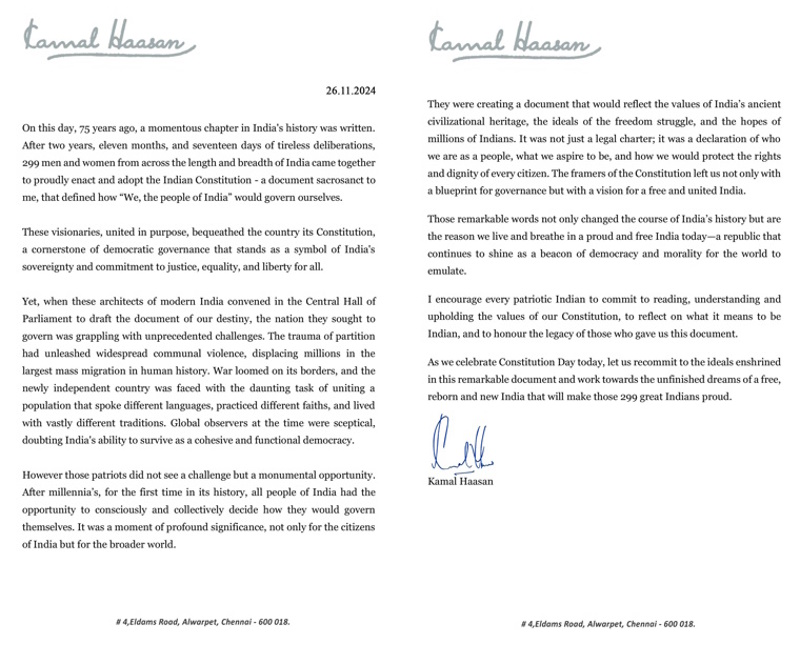 കമൽഹാസൻ സോഷ്യൽ മീഡിയയിൽ പങ്കുവെച്ച കുറിപ്പിൽ നിന്നുള്ള പ്രസക്ത ഭാഗങ്ങൾ ഇപ്രകാരമാണ്: