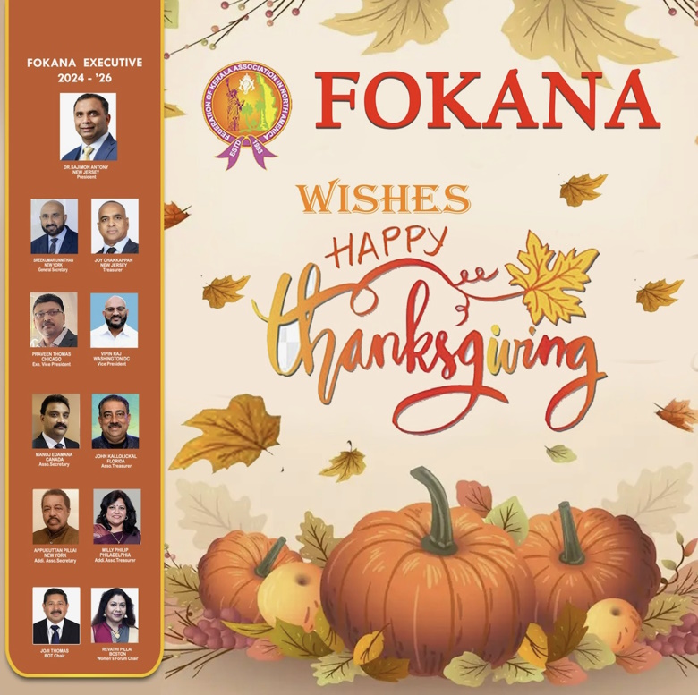 ജീവിതത്തിൽ നാം അനുഭവിക്കുന്ന എല്ലാ നല്ല കാര്യങ്ങൾക്കും നമ്മെ സഹായിച്ചവർക്കും നന്ദി പറയാൻ വേണ്ടി വേർതിരിക്കപ്പെട്ട ഒരു ദിനം ആണല്ലോ താങ്ക്സ് ഗിവിങ്ങ് .ഫൊക്കാനയെ സംബന്ധിച്ചടത്തോളം ഒരു സുവർണ്ണ കാലഘട്ടം നൽകിയതിന് ഏവരോടും നന്ദി പറയുന്നു . അമേരിക്കക്കാരുടെ ജീവിതത്തിൽ ഒഴിവാക്കാന് പറ്റാത്ത ദിനമായി മാറിയ താങ്ക്സ് ഗിവിങ്ങ് ദിനത്തിൽ ലോകത്തിലെ തന്നെ ഏറ്റവും വലുതും പഴക്കവും ആയ മലയാളീ സംഘടനായായ ഫൊക്കാന ഏവർക്കും താങ്ക്സ് ഗിവിങ്ങ് ആശംസകൾ നേരുന്നു.
