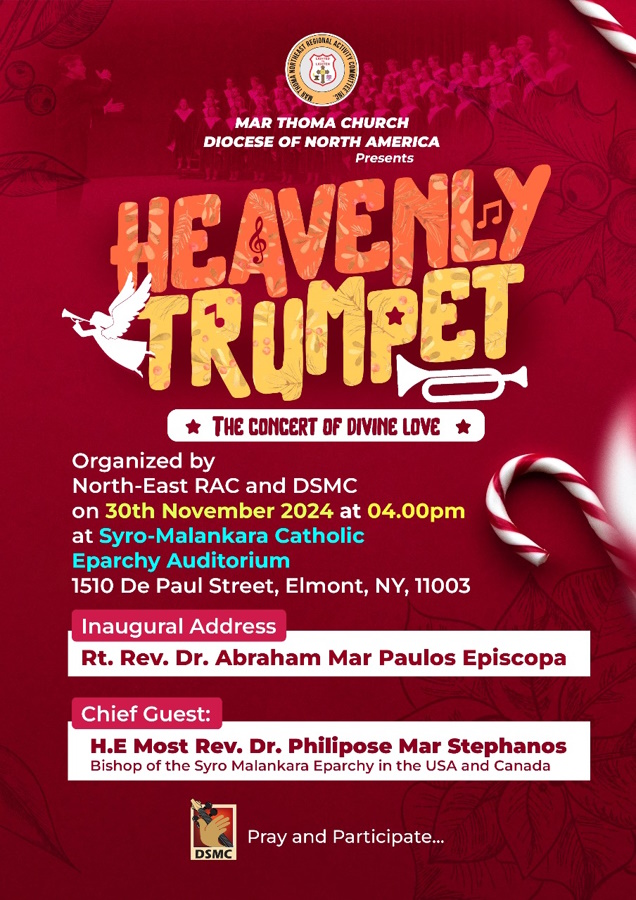 ന്യൂയോർക്ക്: മാർത്തോമ്മാ സഭയുടെ വടക്കേ അമേരിക്കൻ ഭദ്രാസനം ഇദംപ്രഥമമായി നടത്തുന്ന ക്രിസ്മസ് വിളംബര ഗാനസന്ധ്യയായ “ഹെവൻലി ട്രമ്പറ്റ്” അഥവാ “സ്വർഗ്ഗീയ കാഹളം” എന്ന ക്രിസ്മസ് ഗാനസന്ധ്യ നവംബർ മാസം മുപ്പതാം തീയതി വൈകുന്നേരം നാലു മണിക്ക് എൽമോണ്ടിലുള്ള സിറോ മലങ്കര കത്തോലിക്ക എപ്പാർക്കി ആഡിറ്റോറിയത്തിൽ (1510 DePaul Street, Elmont, NY 11003) വച്ച് നടത്തപ്പെടുന്നു.