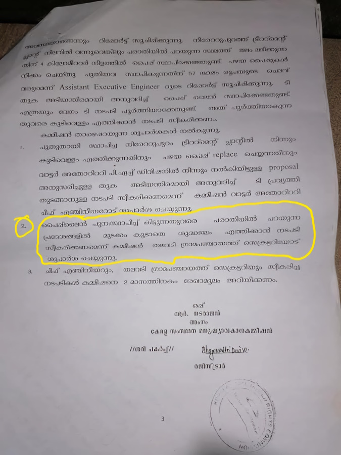 തലവടി തെക്കെ കരയിലെ കുടി വെള്ള ക്ഷാമത്തിന് ശാശ്വത പരിഹാരം കാണണമെന്ന് ആവശ്യപ്പെട്ട് പൊതു പ്രവർത്തകൻ തലവടി സൗഹൃദ നഗറിൽ വാലയിൽ ബെറാഖാ ഭവനിൽ ഡോ. ജോൺസൺ വി.ഇടിക്കുള നല്കിയ ഹർജിയെ തുടർന്ന് 2014 ജൂലൈ 7ന് മനുഷ്യാവകാശ കമ്മീഷൻ അംഗം ജസ്റ്റിസ് ആര് നടരാജൻ തലവടി ഗ്രാമപഞ്ചായത്ത് സെക്രട്ടറിക്ക് നല്കിയ ഉത്തരവ് നടപ്പിലാക്കുകയോ ഈ പ്രദേശത്ത് പൊതുടാപ്പിലൂടെ ശുദ്ധജല വിതരണം ആരംഭിക്കുകയോ ചെയ്തിട്ടില്ല. പ്രാഥമിക ആവശ്യങ്ങള്ക്ക് പോലും വേനൽക്കാലത്ത് ജലം പണം കൊടുത്ത് വാങ്ങുകയാണ്. വെള്ളപൊക്ക സമയത്ത് ഈ പ്രദേശത്തെ കിണറുകളിൽ മലിനജലം ഉറവയായി ഇറങ്ങുന്നത് മൂലം ശുദ്ധജലം കിട്ടാക്കനിയാണ്.