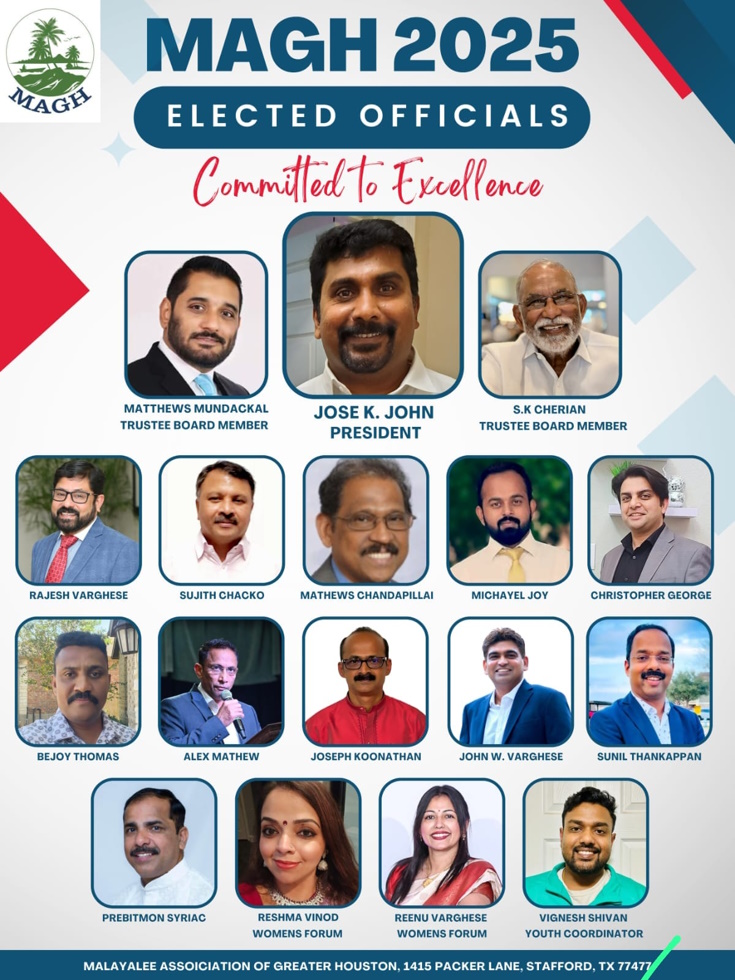 ഹൂസ്റ്റൺ: മലയാളി അസോസിയേഷൻ ഓഫ് ഗ്രേറ്റർ ഹൂസ്റ്റൺ (MAGH) 2025-ലേക്ക് പുതുതായി എതിരില്ലാതെ തിരഞ്ഞെടുക്കപ്പെട്ട ഭാരവാഹികളെ അഭിമാനപൂർവ്വം പ്രഖ്യാപിക്കുന്നു. സമൂഹത്തോട് പ്രതിജ്ഞാബദ്ധരും ഹൂസ്റ്റണിലെ മലയാളി സമൂഹത്തെ സേവിക്കുന്നതിൽ അർപ്പണബോധമുള്ളവരുമായ ഈ വ്യക്തികൾ, 2024 ഡിസംബർ 28-ന് ഇമ്മാനുവൽ മാർത്തോമ്മാ ഓഡിറ്റോറിയത്തിൽ നടത്താൻ നിശ്ചയിച്ചിരിക്കുന്ന MAGH ക്രിസ്മസ് പുതുവത്സര ആഘോഷ വേളയിൽ ഔദ്യോഗികമായി സത്യപ്രതിജ്ഞ ചെയ്യും.