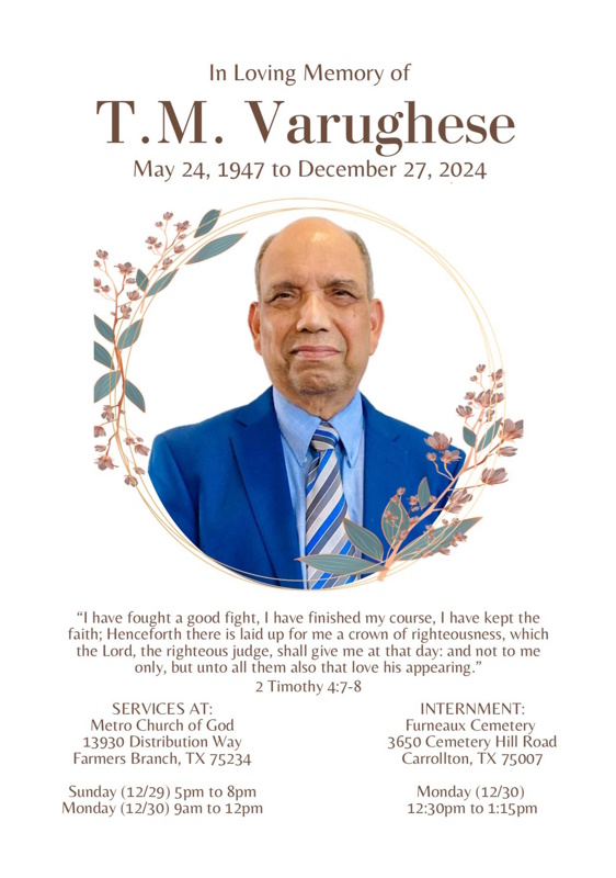 ഡാളസ്: പ്ലാങ്കമൺ, അയിരൂർ സ്വദേശിയും ചെറുകര തടത്തിൽ ഭവനത്തിൽ പരേതനായ തോമസ് മാത്യൂവിൻ്റെയും പരേതയായ മറിയാമ്മ മാത്യുവിന്റെയും 8 മക്കളിൽ മൂന്നാമത്തെ മകനായ റ്റി.എം. വർഗ്ഗീസ്.ഡാളസിൽ അന്തരിച്ചു.