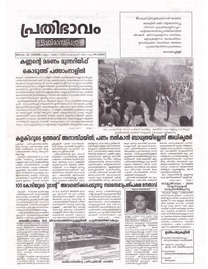 ‘കളക്ടറുടെ ഉത്തരവ് അനാസ്ഥയിൽ; പണം നല്കാൻ ബാധ്യതയില്ലെന്ന് അധികൃതർ’ എന്ന തലക്കെട്ടോടെ വന്ന വാർത്തയെ തുടർന്ന്, വിഷയം നാട്ടിൽ വലിയ പ്രതിഷേധത്തിന് ഇടയാക്കി. തിരുവനന്തപുരത്തുള്ള ജനകീയാസൂത്രണ പദ്ധതിയുടെ ഹെഡ് ഓഫീസിലും ഈ പത്രവാർത്ത എത്തുകയുണ്ടായി. അവിടെ നിന്നും പഞ്ചായത്തിലേക്ക് അന്വേക്ഷണവുമെത്തി. വാർത്ത വന്ന് രണ്ടാഴ്ച്ചയാകാറായപ്പോഴേക്കും പഞ്ചായത്തിൽ നിന്നും അവസാന ഗഡുവും പാസാക്കി കിട്ടി. മുഖ്യധാരപത്രങ്ങൾക്കിടയിലും പ്രാദേശിക പ്രശ്നങ്ങളെ പ്രാധാന്യത്തോടെ പ്രസിദ്ധീകരിക്കുന്ന പ്രാദേശിക പത്രങ്ങളുടെ പ്രസക്തി ഈയൊരു ചെറു പത്രത്തിലൂടെ ബോധ്യപ്പെട്ട ഒരു സംഭവമായിരുന്നു അത്. കവിയും ചലച്ചിത്ര സംവിധായകനുമായ സതീഷ് കളത്തിൽ ആയിരുന്നു പ്രതിഭാവത്തിന്റെ എഡിറ്റർ. 2010 ജനുവരിയിൽ ആരംഭിച്ച ഈ പത്രത്തിന് ഈ ജനുവരിയിൽ കാൽനൂറ്റാണ്ട് തികയുമ്പോൾ, ആ പത്രം ഇന്നില്ല.