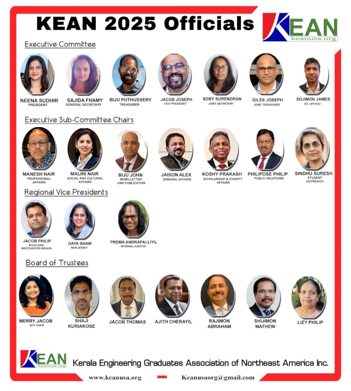 ന്യൂയോർക്ക് : കഴിഞ്ഞ 16 വർഷമായി നോർത്ത് അമേരിക്കയിലെ മലയാളി എൻജിനീയേഴ്സിന്റെ ഇടയിൽ സ്ത്യുത്യർഹമായ സേവനം അനുഷ്ഠിക്കുന്ന കേരളാ എൻജിനീയറിങ് ഗ്രാജുവേറ്റ്സ് അസോസിയേഷൻ ഓഫ് നോർത്ത് അമേരിക്കയുടെ (KEAN) 2025 ലെ ഭരണ സമിതിയെ ഡിസംബർ 28 നു ഓറഞ്ച് ബെർഗിലെ സിതാർപാലസിൽ നടന്ന ജനറൽ ബോഡി മീറ്റിംഗിൽ വച്ച് തിരഞ്ഞെടുത്തു.