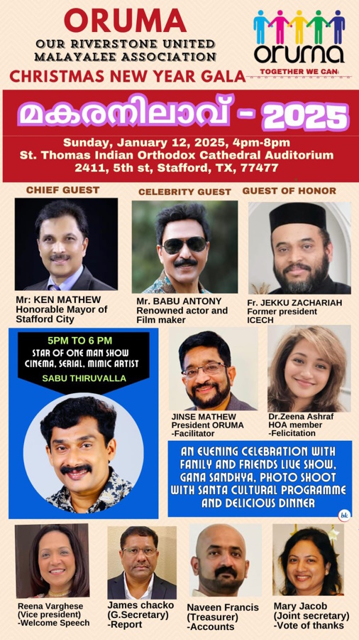 ഹൂസ്റ്റൺ: റിവർസ്റ്റോൺ ഒരുമയുടെ ക്രിസ്തുമസ്,പുതുവൽസര കുടുബ സംഗമമായ മകര നിലാവ് 2025 ആഘോഷം ജനുവരി പന്ത്രണ്ടാംതീയതി ഞായറാഴ്ച്ച 4 മണി മൂതൽ സെയ്ൻറ് തോമസ് ഇൻഡ്യൻ ഓർത്തഡോക്സ് കത്തീഡ്രൽ ആഡിറ്റോറിയത്തിൽ നടക്കും.
