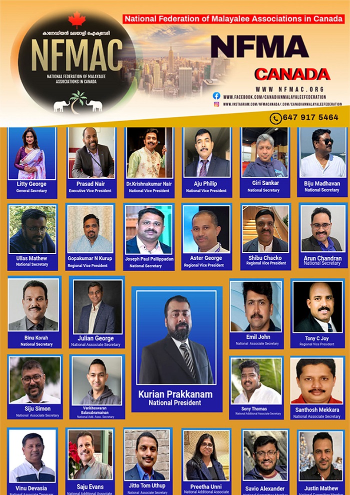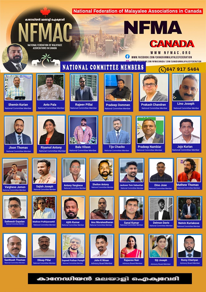 കാനഡയിലെ വിവിധ മലയാളി സംഘടനാകളിൽ നിന്നും ഉള്ള ഭാരവാഹികളെ കോർത്തിണക്കി NFMA Canada അതിന്റെ നാഷണൽ കമ്മറ്റി രൂപീകരണം നടത്തിയിരിക്കുന്നത് . വിവിധ പ്രോവിൻസുകളിലെ വിവിധ ഭൂപ്രദേശങ്ങളിലും ഉള്ള നേതാക്കളെ ഉൾപ്പെട്ടതാണ് സംഘടനയുടെ ദേശീയ ഭരവാഹികൾ. ചെറുതും വലുതുമായ എല്ലാ സംഘടനകളെയും NFMAC ലേക്ക് സ്വാഗതം ചെയ്യുന്നു എന്ന് ജെനറൽ സെക്രട്ടറി ലിറ്റി ജോർജ്ജ് നാഷണൽ എക്സിക്യൂറ്റീവ് പ്രസിഡണ്ട് പ്രസാദ് നായർ, വൈസ് പ്രസിഡണ്ട് ഡോ. കൃഷ്ണന് നായർ, അജൂ ഫിലിപ് , നാഷണൽ സെക്രട്ടറിമാരായ ഗിരി ശങ്കർ ,ഉല്ലാസ് മാത്യു ,ബിജു മാധവൻ, ജോസഫ് പോൾ പള്ളിപ്പാടൻ , അരുൺ ചന്ദ്രൻ , ബിനൂ കോര, റീജിനൽ വൈസ് പ്രസിഡണ്ട്മാരായ ടോണി സി ജോയ്, ഗോപകുമാര് കുറുപ്പ്, ആസ്റ്റര് ജോർജ്ജ് ,ഷിബു ചാക്കോ നാഷണൽ അസോസിയേറ്റ് സെക്രട്ടറിമാരായ ജൂലിയൻ ജോർജ്ജ് , ഏമിൽ ജോൺ,സിജു സൈമൺ ,സന്തോഷ് മേക്കര, ജീറ്റോ ടോം, എന്നിവരും നാഷണൽ അഡിഷണൽ അസോസിയേറ്റ് സെക്രട്ടറിമാരായ സാജു ഇവാൻ സോണി തോമസ, പ്രീതി ഉണ്ണി ,അസോസിയേറ്റ് ട്രഷറാർ ലിനോ ജേക്കബ്, വിനു ദേവസ്യ എന്നിവരും മാധ്യമങ്ങളെ അറിയിച്ചു.. ഏതാണ്ട് അറുപതിൽ പരം സംഘടനകൾ NFMA Canada യിൽ ഭാഗമായി പ്രവരത്തിക്കുന്നു.