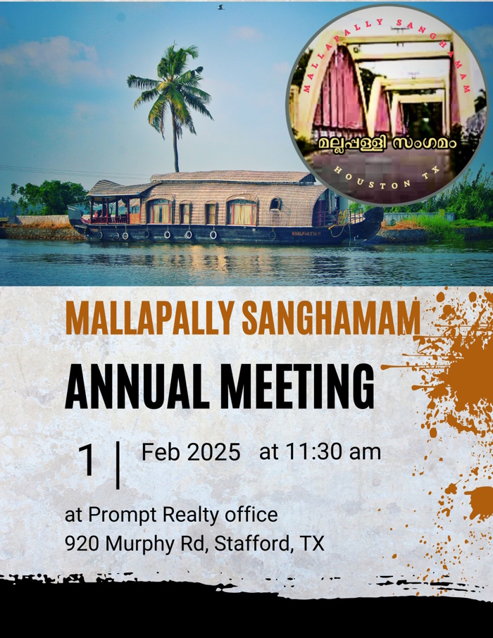 ഹൂസ്റ്റൺ: ഹൂസ്റ്റണിലെ പ്രമുഖ മലയാളി സംഘടനകളിലൊന്നായ മല്ലപ്പള്ളി സംഗമത്തിന്റെ 2025 ലെ പൊതുയോഗവും കുടുംബ സംഗമവും വിപുലമായ പരിപാടികളുടെ ഫെബ്രുവരി 1 നു ശനിയാഴ്ച രാവിലെ 11 മുതൽ 2 വരെ സ്റ്റാഫോഡിൽ വച്ച് (920, Murphy Road, Stafford, TX) വിപുലമായ പരിപാടികളോടെ നടത്തപ്പെടുന്നതാണ്. സമ്മേളനത്തിലേക്ക് സംഗമത്തിന്റെ അംഗങ്ങളായ എല്ലാ സുഹൃത്തുക്കളെയും ക്ഷണിക്കുന്നുവെന്ന് ഭാരവാഹികൾ അറിയിച്ചു. സംഗമത്തിന്റെ വിദ്യാഭ്യാസ സഹായ നിധി റിപ്പോർട്ടും കഴിഞ്ഞ വർഷത്തെ പ്രവർത്തന റിപ്പോർട്ടും സെക്രട്ടറി റെസ്‌ലി മാത്യുവും വാർഷിക കണക്ക് ട്രഷറർ സെന്നി ഉമ്മനും അവതരിപ്പിക്കുമെന്ന് പ്രസിഡണ്ട് ചാക്കോ നൈനാൻ അറിയിച്ചു.