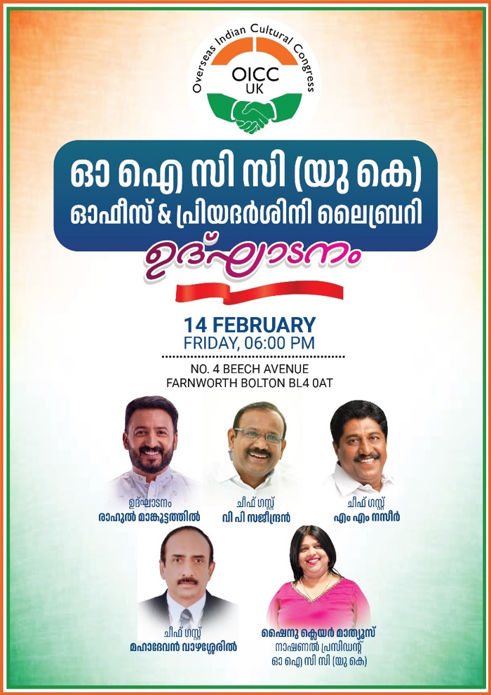 ബോൾട്ടൻ: യു കെ പ്രവാസി മലയാളി സമൂഹത്തെ പ്രതിനിധീകരിക്കുന്ന പ്രമുഖ സംഘടനയായ ഓവർസീസ് ഇന്ത്യൻ കൾച്ചറൽ കോൺഗ്രസ് (ഓ ഐ സി സി) – ക്ക് മാഞ്ചസ്റ്ററിലെ ബോൾട്ടനിൽ ഓഫീസ് കെട്ടിടവും വായനശാലയും ഒരുങ്ങുന്നു. ഫെബ്രുവരി 14ന് യു കെയിൽ തന്റെ ആദ്യ യൂറോപ്യൻ സന്ദർശനത്തിനെത്തുന്ന പാലക്കാട് എം എൽ എയും യൂത്ത് കോൺഗ്രസ് സംസ്ഥാന അദ്ധ്യക്ഷനുമായ രാഹുൽ മാങ്കൂട്ടത്തിൽ എം എൽ എ ഓ ഐ സി സി ഓഫീസ് കെട്ടിടത്തിന്റെയും പ്രിയദർശിനി വായനശാലയുടെയും ഉദ്ഘാടനം നിർവഹിക്കും.