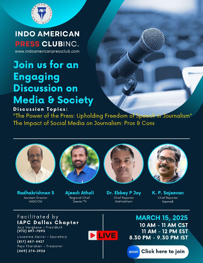 ഡാളസ് : പ്രവാസലോകത്തെ മാധ്യമ പ്രവർത്തകരുടെ പ്രോത്സാഹനത്തിനും വളർച്ചക്കും ഉപകാര പ്രഥമാകുന്ന മാധ്യമ സെമിനാറും വിവിധ പ്രോഗ്രാമുകളുമാണ് ഡാളസ് ചാപ്റ്ററിൻ്റെ ആഭിമുഖ്യത്തിൽ ഈ വർഷം ആസൂത്രണം ചെയ്തിതിരിക്കുന്നത്. മാർച്ച് 15 ശനിയാഴ്ച രാവിലെ പത്ത് മണിക്ക് (US central time) പ്രഥമ സെമിനാറിന് തുടക്കം കുറിക്കും. അനുദിനം മാറികൊണ്ടിരിക്കുന്ന മാധ്യമ അന്തരിക്ഷത്തിൽ പത്ര പ്രവർത്തകരുടെ കടമകൾ, അഭിപ്രായ സ്വാതന്ത്ര്യം, സോഷ്യൽ മീഡീയ മൂലം സംഭവിക്കുന്ന ഗുണങ്ങളും ദോഷങ്ങളും, തുടങ്ങിയ വിഷയങ്ങളാണ് സെമിനാറിലെ മുഖ്യ വിഷയങ്ങൾ. അതൊടൊപ്പം പ്രവാസി മലയാളികൾ ഇന്ന് അനുഭവിക്കുന്ന വിമാന ടിക്കറ്റുകളുടെ അമിത വർദ്ധനവ്, വസ്തുക്കളുടെ ക്രയവിക്രയത്തിൽ ഏർപ്പെടുത്തിയിരിക്കുന്ന അമിത നികുതി വർദ്ധനവ് തുടങ്ങിയ വിഷയങ്ങളും ഈ സെമിനാറിലെ ചർച്ചാ വിഷയങ്ങളായ് തെരഞ്ഞെടുത്തിട്ടുണ്ട്.
