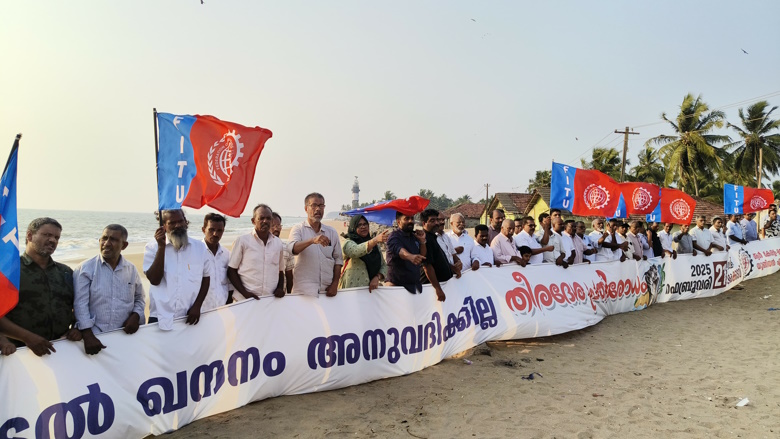 പൊന്നാനി: തീര കടൽ മണൽ ഖനനത്തിനെതിരെ പൊന്നാനി മര ക്കടവിൽ വൻ ജനകീയ പ്രതിഷേധം. കടലും തീരവും ഖനനത്തിന് വിട്ടു നൽകില്ലെന്ന് പ്രഖ്യാപിച്ചുകൊണ്ട് നൂറുകണക്കിന് തൊഴിലാളികളും, നാട്ടുകാരും കടൽ തീരത്ത് പ്രതിരോധ മതിൽ തീർത്തു. തുടർന്ന് നടന്ന പൊതുസമ്മേളനം FITU സംസ്ഥാന പ്രസിഡന്റ് ജ്യോതിവാസ് പറവൂർ ഉദ്ഘാടനം ചെയ്തു. “തീരക്കടൽ ഖനനം ജീവൻ നൽകിയും പ്രതിരോധിക്കും” എന്ന് അദ്ദേഹം പ്രഖ്യാപിച്ചു.