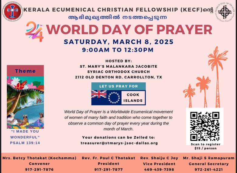 ഡാളസ് :കേരള എക്യുമെനിക്കൽ ക്രിസ്ത്യൻ ഫെലോഷിപ്പിന്റെ ആഭിമുഖ്യത്തിൽ മാർച്ച് 8നു ശനിയാഴ്ച ഡാലസിൽ ലോക പ്രാർത്ഥനാ ദിനം സംഘടിപ്പിക്കുന്നു .ലോക പ്രാർത്ഥനാ ദിനം എന്നത് എല്ലാ വർഷവും മാർച്ച് മാസത്തിൽ ഒരു പൊതു പ്രാർത്ഥനാ ദിനം ആചരിക്കാൻ ഒത്തുചേരുന്ന നിരവധി വിശ്വാസങ്ങളിലും പാരമ്പര്യത്തിലുമുള്ള സ്ത്രീകളുടെ ഒരു ലോകമെമ്പാടുമുള്ള എക്യുമെനിക്കൽ പ്രസ്ഥാനമാണ്.