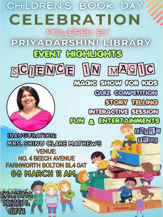 ബോൾട്ടൺ: പ്രിയദർശിനി ലൈബ്രറിയുടെ(ബോൾട്ടൻ) ആഭിമുഖ്യത്തിൽ കുട്ടികൾക്കായി വിവിധ വിജ്ഞാന – വിനോദ പരിപാടികൾ കോർത്തിണക്കിക്കൊണ്ട് ‘ബുക്ക് ഡേ’ സംഘടിപ്പിക്കുന്നു. മാർച്ച് 8 ശനിയാഴ്ച രാവിലെ 11 മണിക്ക് ബോൾട്ടനിലെ പ്രിയദർശിനി ലൈബ്രറി ഹാളിൽ വച്ച് ശ്രീമതി ഷൈനു ക്ലെയർ മാത്യൂസ് ചടങ്ങ് ഉദ്ഘാടനം ചെയ്യും.