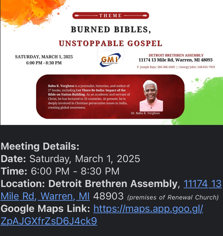 ഡിട്രോയിറ്റ് :മിഷിഗണിൽ ആസ്ഥാനമായുള്ള ഗോസ്പൽ മിഷൻസ് ഓഫ് ഇന്ത്യ (GMI) പ്രത്യേക സമ്മേളനം സംഘടിപ്പിക്കുന്നു ഇന്ത്യയിലെ സഹവിശ്വാസികൾ നേരിടുന്ന സമ്മർദ്ദകരമായ വെല്ലുവിളികളെക്കുറിച്ച് വെളിച്ചം വീശുന്നതിനാണ് ഈ ഒത്തുചേരൽ സംഘടിപ്പിച്ചിരിക്കുന്നത്