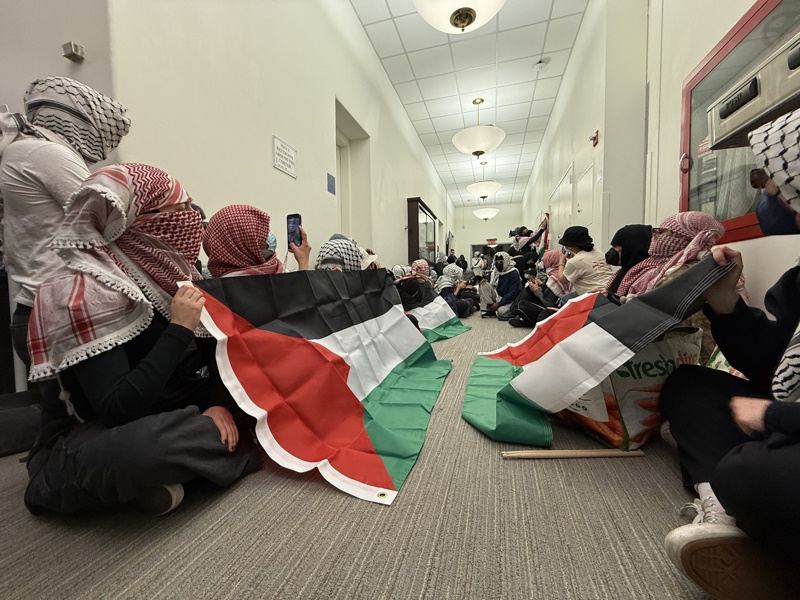 വിദ്യാർത്ഥി സംഘം പോസ്റ്റ് ചെയ്ത വീഡിയോകളിൽ മുഖംമൂടികളും കാഫിയേ സ്കാർഫുകളും ധരിച്ച ആളുകൾ ഇടനാഴിയിൽ മുദ്രാവാക്യം വിളിക്കുന്നത് കാണിക്കുന്നുണ്ട്. ചിലർ ഡ്രംസ് വായിക്കുകയായിരുന്നു, മറ്റുള്ളവർ മെഗാഫോണുകൾ പിടിച്ചു. പലസ്തീൻ പതാകകൾ ചുമരുകളിൽ തൂക്കിയിട്ടിരുന്നു, “ബെർണാർഡ് വംശഹത്യയ്ക്ക് ധനസഹായം നൽകുന്നു”, “സ്വതന്ത്ര പാലസ്തീൻ” തുടങ്ങിയ മുദ്രാവാക്യങ്ങൾ ചുമരുകളിൽ എഴുതിയിരുന്നു.