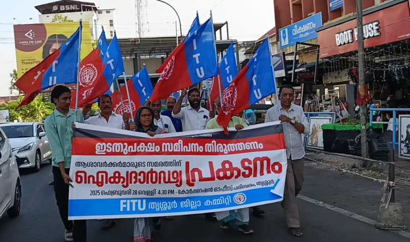 തൃശൂർ: പത്തൊൻപത് ദിവസം പിന്നിടുന്ന ആശാ വർക്കർമാരുടെ അനിശ്ചിത കാല രാപകൽ സമരത്തിന് എഫ് ഐ ടി യു തൃശൂർ ജില്ലാ കമ്മിറ്റിയുടെ ആഭിമുഖ്യത്തിൽ ഐക്യദാർഢ്യപ്രകടനവും സംഗമവും സംഘടിപ്പിച്ചു. തൃശൂർ കോർപ്പറേഷൻ പരിസരത്ത് നടന്ന ഐക്യദാർഢ്യ സംഗമം എഫ് ഐ ടി യു സംസ്ഥാന ട്രഷറർ ഉസ്മാൻ മുല്ലക്കര ഉദ്ഘാടനം ചെയ്തു.