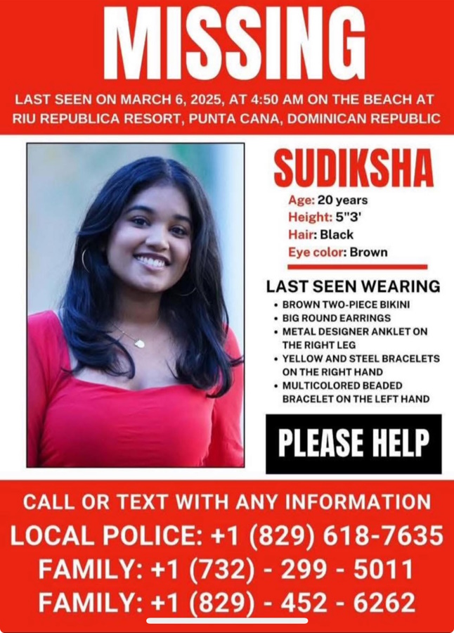 സുദീക്ഷ കൊണങ്കി, സഹപാഠികളോടൊപ്പം ഡൊമിനിക്കൻ റിപ്പബ്ലിക്കിലേക്കുള്ള വസന്തകാല അവധിക്കാല യാത്രയിലായിരുന്നു. റിസോർട്ട് പട്ടണമായ പുന്റ കാനയിൽ തന്റെ സുഹൃത്തുക്കളുടെ കൂട്ടത്തോടൊപ്പം സുദീക്ഷ ഉണ്ടായിരുന്നു, നാല് ദിവസം മുമ്പ് വ്യാഴാഴ്ച ബീച്ചിൽ നടക്കുമ്പോൾ അവസാനമായി കണ്ടു. അതിനുശേഷം ആരും അവളെ കാണുകയോ അവളെ കുറിച്ച് കേൾക്കുകയോ ചെയ്തിട്ടില്ല.