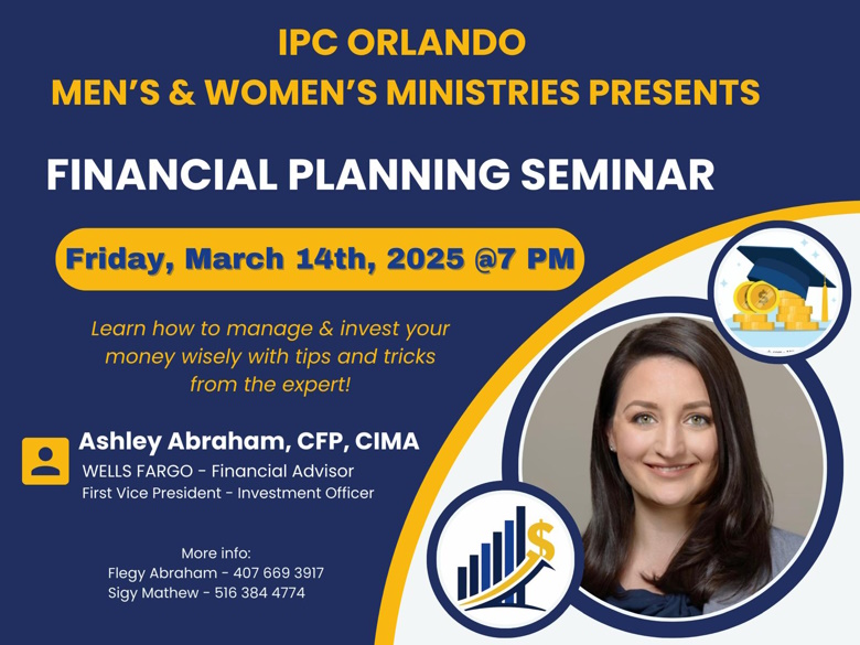 ഒർലാന്റോ ഇന്ത്യ പെന്തക്കോസ്ത് ദൈവസഭയിൽ 14ന് വെള്ളിയാഴ്ച വൈകിട്ട് ഏഴിന് ആരംഭിക്കുന്ന സെമിനാറിൽ വെൽസ് ഫാർഗോ ബാങ്കിന്റെ ഫസ്റ്റ് വൈസ് പ്രസിഡന്റും അഡ്വൈസറുമായ ആഷ്ലി എബ്രഹാം ക്ലാസ്സുകൾക്ക് നേതൃത്വം നൽകും