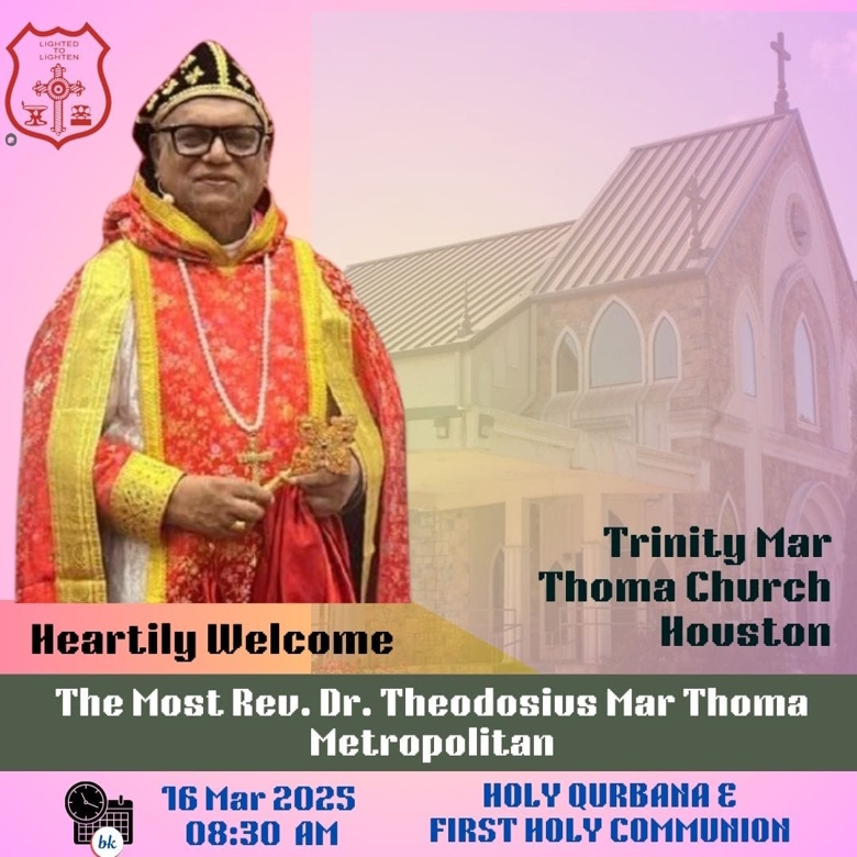 മെയ് 16 നു ഞായറാഴ്ച രാവിലെ 8:30 ന് വിശുദ്ധ കുർബാനയ്ക്ക് തിരുമേനി മുഖ്യകാർമികത്വം വഹിയ്ക്കും. ആരാധനയോടനുബന്ധിച്ചു 10 കുട്ടികൾ അഭിവന്ദ്യ തിരുമേനിയിൽ നിന്നും ആദ്യ കുര്ബാന സ്വീകരിക്കും.വികാരി റവ സാം കെ ഈശോ അസിസ്റ്റൻറ് വികാരി റവ ജീവൻ ജോൺ. റവ. ഉമ്മൻ ശാമുവേൽ എന്നിവർ സഹ കാർമികത്വം വഹിക്കും