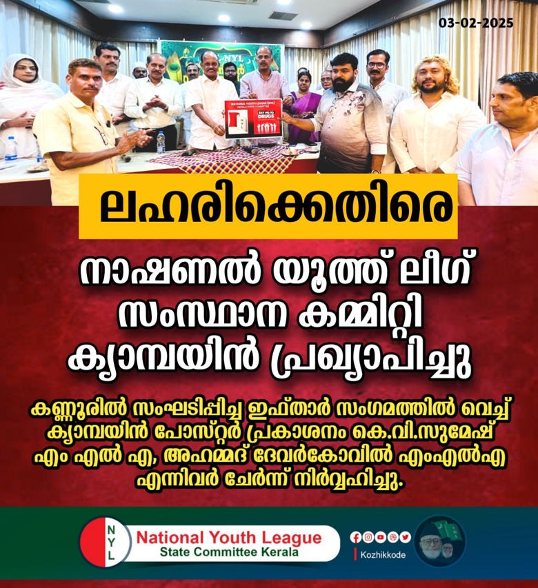 കണ്ണൂർ: നാടിനെ ഒന്നാകെ നാശത്തിലേക്ക് നയിക്കുന്ന ലഹരിക്കെതിരെ നാഷണൽ യൂത്ത് ലീഗ് സംസ്ഥാന കമ്മിറ്റി ക്യാമ്പയിൻ പ്രഖ്യാപിച്ചു. 2025 മാർച്ച് 15 മുതൽ ഏപ്രിൽ 15 വരെ സംസ്ഥാനത്ത് എല്ലാ ജില്ലകളിലും വ്യത്യസ്ത പരിപാടികൾ ആവിഷ്കരിച്ച് ലഹരിക്കെതിരെയുള്ള പോരാട്ടം ശക്തിപ്പെടുത്തുമെന്ന് നേതാക്കൾ പറഞ്ഞു.