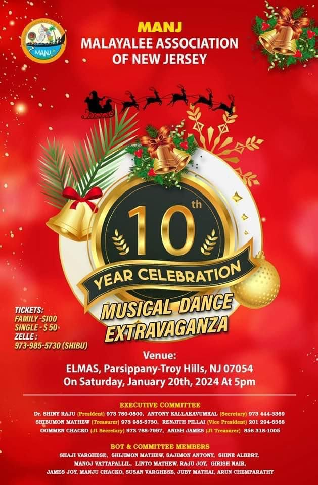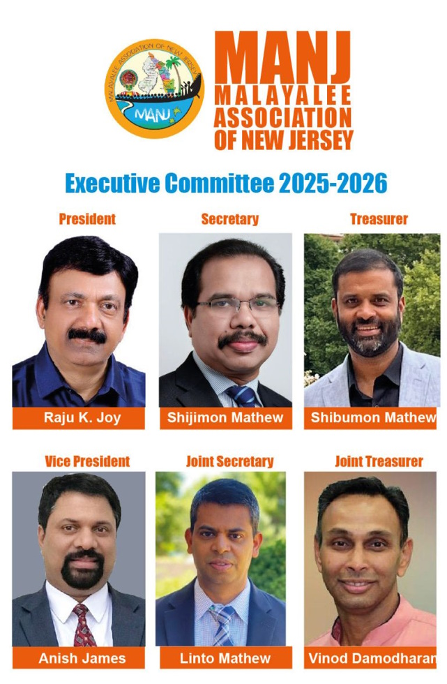 ന്യൂജെഴ്സി: ന്യൂജെഴ്സിയിലെ പ്രമുഖ സംഘടനയായ മലയാളി അസ്സോസിയേഷന് ഓഫ് ന്യൂജെഴ്സി (MANJ) ക്ക് നവ നേതൃത്വം. ന്യൂജെഴ്സിയിലെ പാഴ്സിപ്പനിയിലുള്ള ലേക് ഫയർ കമ്പനി ഹാളിൽ ട്രസ്റ്റീ ബോർഡ് ചെയർ ഷാജി വര്ഗീസിന്റെ അദ്ധ്യക്ഷതയിൽ ചേർന്ന വാർഷിക പൊതുയോഗത്തിൽ വെച്ചാണ് 2025 -2026 കാലയളവിലേക്കുള്ള ഭാരവാഹികളെ തിരഞ്ഞെടുത്തത്.